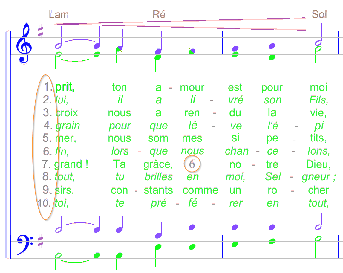 If a syllable is not linked to the correct chord, we can modify this link manually by dragging from the syllable to the suitable chord. This will update on-the-fly the line data (voice, verse, location).
